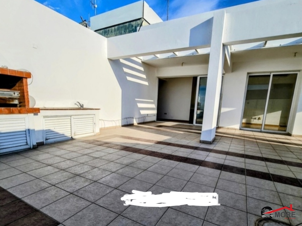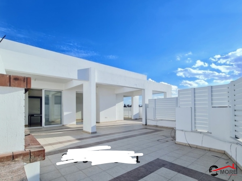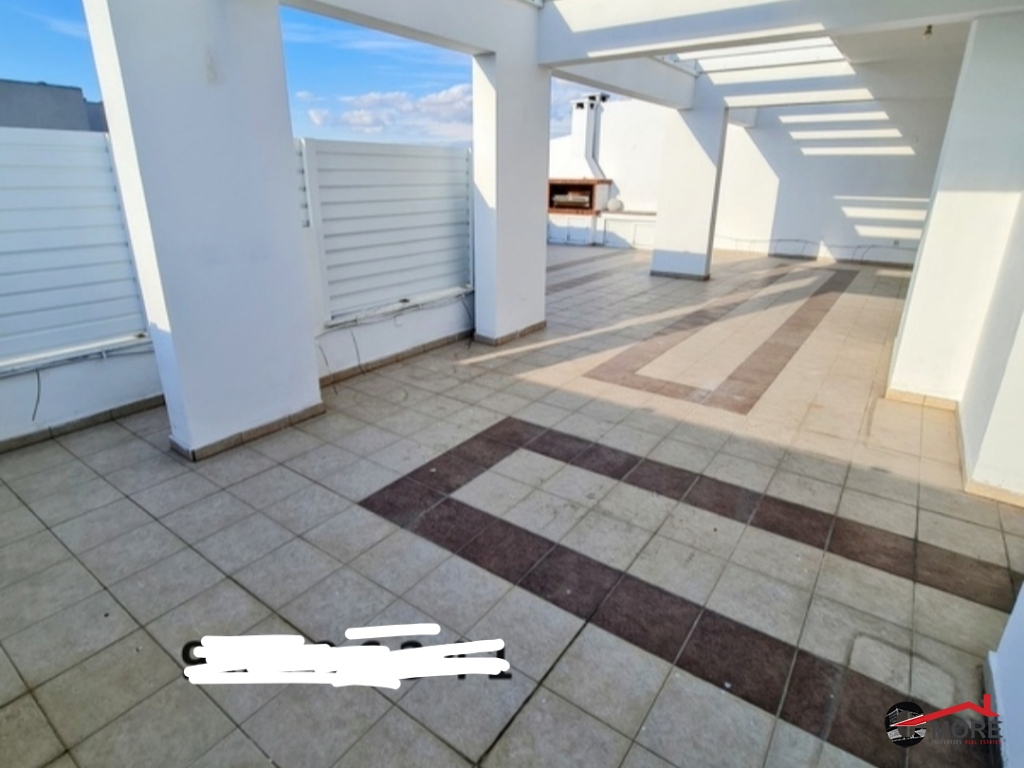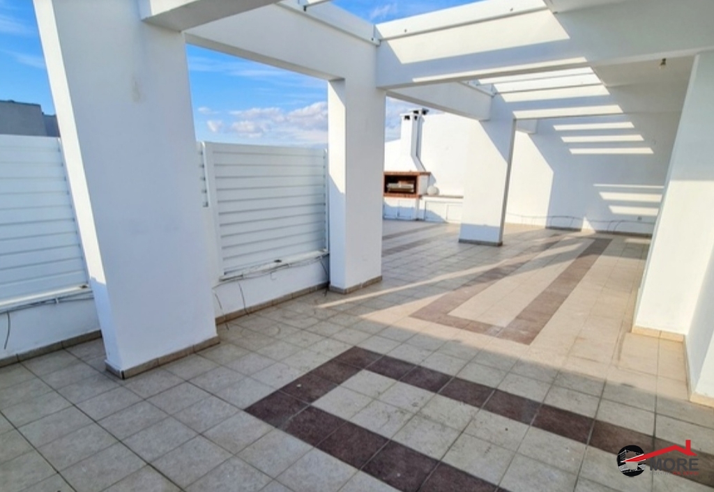 Ένα πανέμορφο διαμέρισμα 2 υπνοδωματίων, στον τελευταίο όροφο μικρής πολυκατοικίας. Με τεράστια βεράντα (105 τετραγωνικά), ψησταριά. Στο εσωτερικό υπάρχουν 2 υπνοδωμάτια, το ένα με δική του τουαλέτα και ντουζιέρα, νεροχύτη, ενώ υπάρχει ακόμη μια τουαλέτα, με νεροχύτη και μπάνιο. Σε όλα τα υπνοδωμάτια υπάρχουν εξωτερικά παράθυρα (με φυλλαράκια). Η κουζίνα έχει 3 παράθυρα και εφάπτεται του καθιστικού. Συνολικό εμβαδό 185 τετραγωνικά μέτρα.