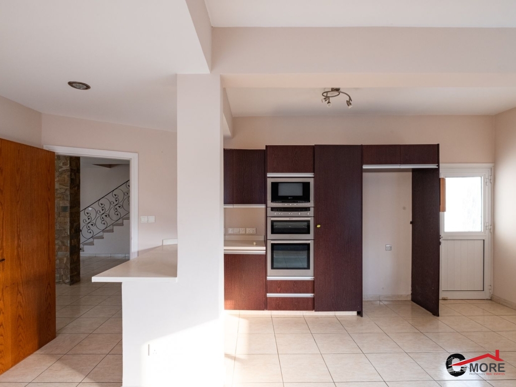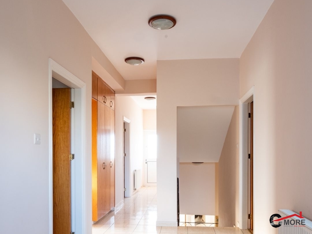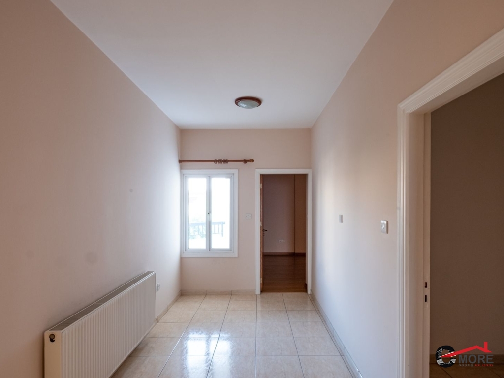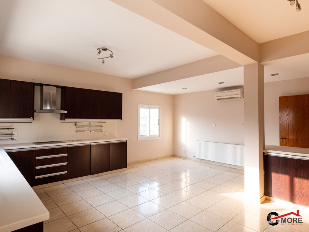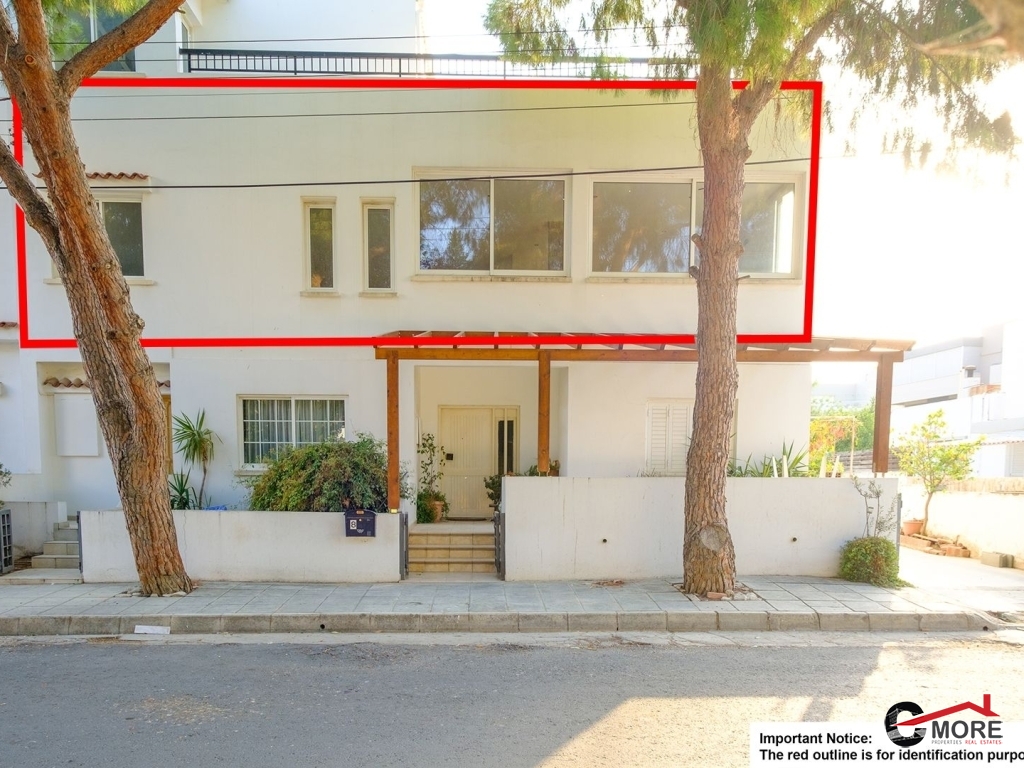 • Το διαμέρισμα βρίσκεται στο δυτικό τμήμα του 1ου ορόφου και ολόκληρου του 2ου ορόφου του κτηρίου και περιλαμβάνει στον 1ο όροφο σαλόνι, τραπεζαρία, κουζίνα και τουαλέτα επισκεπτών και στον 2ο όροφο ένα μπάνιο με τουαλέτα, τρία υπνοδωμάτια ( το master ensuite και ντουλάπα), λεβητοστάσιο, αποθήκη, πλυσταριό και μια μικρή σκεπαστή βεράντα και μια ακάλυπτη βεράντα (εν μέρει καλυμμένη με πέργκολα) με μπάρμπεκιου. Οι επενδύσεις δαπέδου είναι κατασκευασμένες από κεραμικά πλακίδια εκτός από τα υπνοδωμάτια όπου έχει τοποθετηθεί παρκέ (laminated). Οι πάγκοι εργασίας της κουζίνας είναι από γρανίτη, με ξύλινα ντουλάπια. Τα κουφώματα είναι διπλά τζάμια από κουφώματα αλουμινίου και επενδύσεις αλουμινίου εξωτερικά. Το διαμέρισμα εξυπηρετείται από κεντρική θέρμανση και τζάκι στο σαλόνι, καθώς και πρόνοια για μονάδες air-conditioner. Διαθέτει και χώρο στάθμευσης.