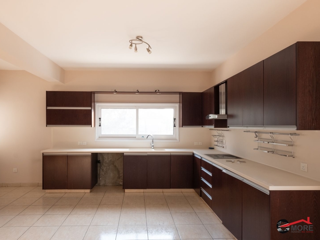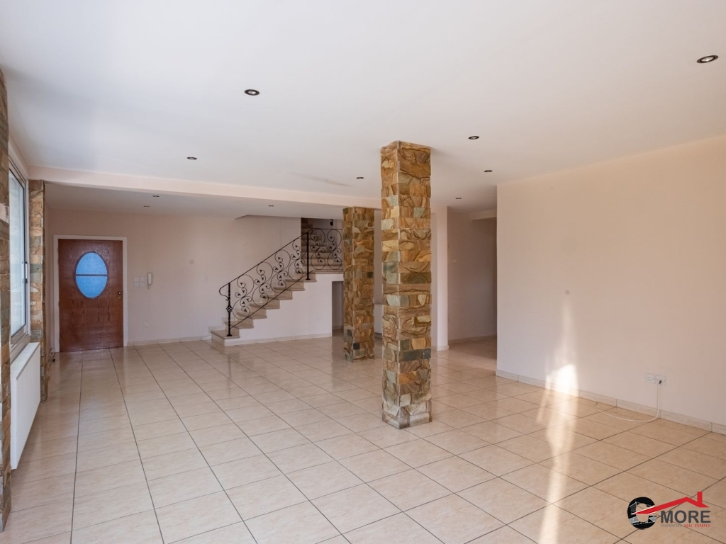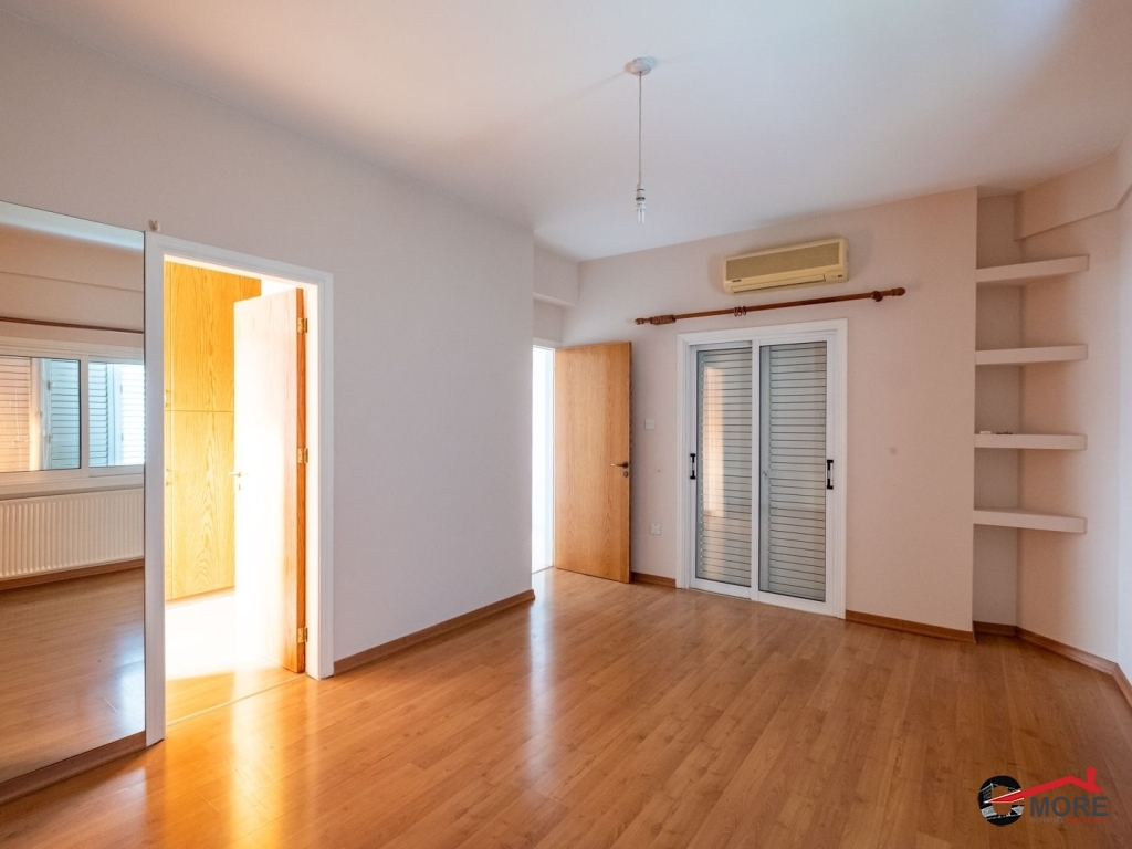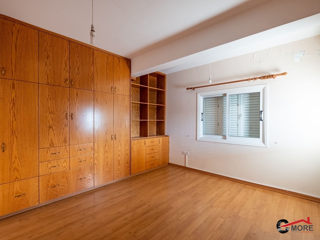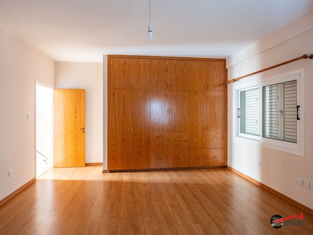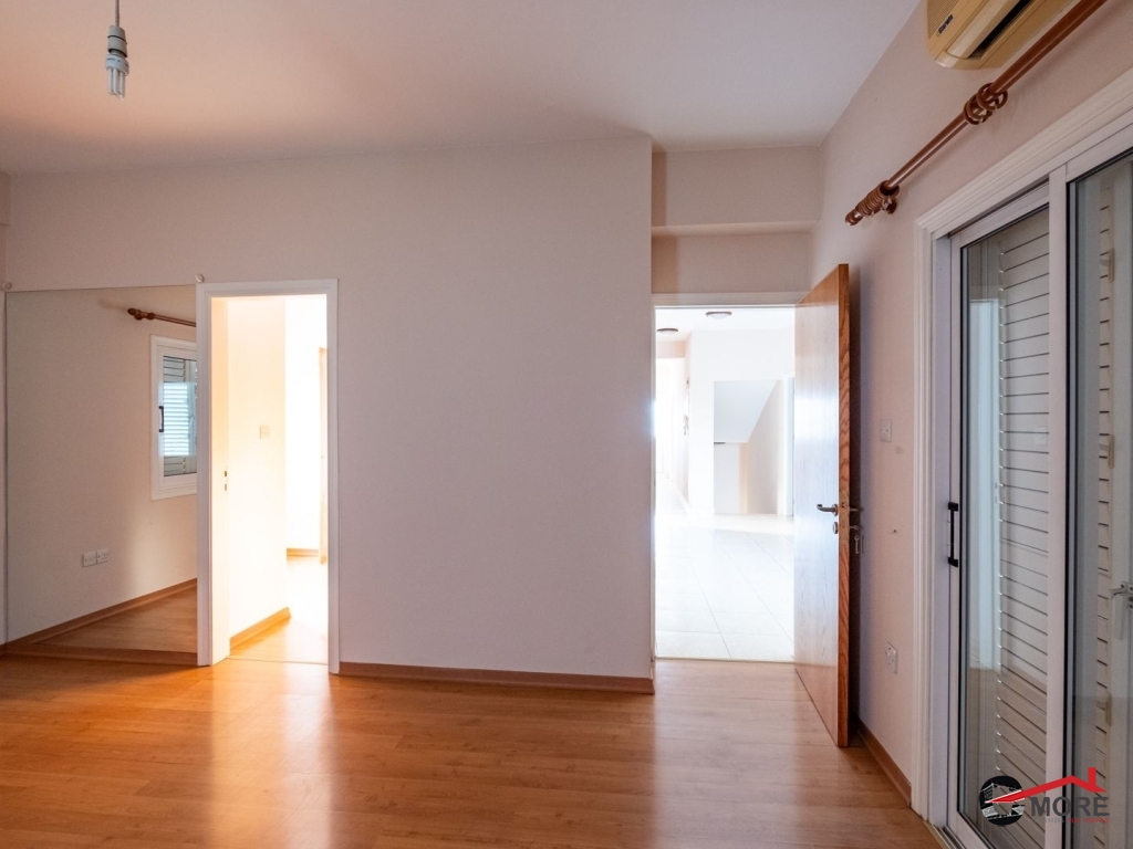 • Το διαμέρισμα βρίσκεται στο δυτικό τμήμα του 1ου ορόφου και ολόκληρου του 2ου ορόφου του κτηρίου και περιλαμβάνει στον 1ο όροφο σαλόνι, τραπεζαρία, κουζίνα και τουαλέτα επισκεπτών και στον 2ο όροφο ένα μπάνιο με τουαλέτα, τρία υπνοδωμάτια ( το master ensuite και ντουλάπα), λεβητοστάσιο, αποθήκη, πλυσταριό και μια μικρή σκεπαστή βεράντα και μια ακάλυπτη βεράντα (εν μέρει καλυμμένη με πέργκολα) με μπάρμπεκιου. Οι επενδύσεις δαπέδου είναι κατασκευασμένες από κεραμικά πλακίδια εκτός από τα υπνοδωμάτια όπου έχει τοποθετηθεί παρκέ (laminated). Οι πάγκοι εργασίας της κουζίνας είναι από γρανίτη, με ξύλινα ντουλάπια. Τα κουφώματα είναι διπλά τζάμια από κουφώματα αλουμινίου και επενδύσεις αλουμινίου εξωτερικά. Το διαμέρισμα εξυπηρετείται από κεντρική θέρμανση και τζάκι στο σαλόνι, καθώς και πρόνοια για μονάδες air-conditioner. Διαθέτει και χώρο στάθμευσης.