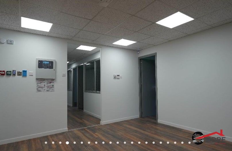 •	Αποτελείται από γραφειακούς χώρους, χώρο υποδοχής, κουζίνα, χώρους υγιεινής (ανδρών και γυναικών), 2 αποθήκες και server room. Το εμβαδό των εσωτερικών χώρων ανέρχεται σε 427 τ.μ (περίπου).